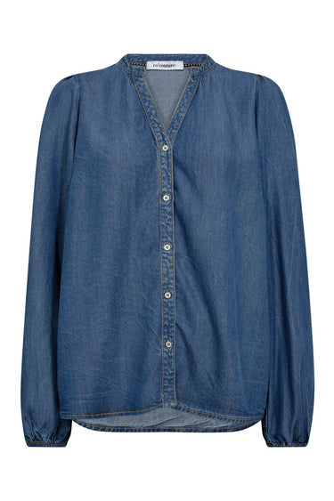 OBS! Fjernlager. Levering kan blive forlænget med 2-3 dage, hvis varen ikke findes i vores butik lige nu.Smart denim bluse fra Co'couture med lange ærmer, v-udskæring i halsen og knaplukning langs fronten.