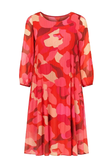 OBS! Fjernlager. Levering kan blive forlænget med 2-3 dage, hvis varen ikke findes i vores butik lige nu.Flot kjole fra 2-Biz med ¾ let puffede ærmer, rund hals og et smukt abstrakt print med en fin plisseret kvalitet.