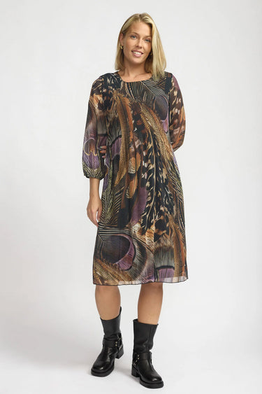 Flot kjole fra 2-Biz med ¾ lange ærmer, rund hals og en flot plisseret kvalitet. Kjolen har også en afslappet silhuet og et smukt print.