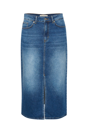 - OBS! Fjernlager. Levering kan blive forlænget med 2-3 dage, hvis varen ikke findes i vores butik lige nu.Klassisk denim nederdel fra Part Two med en flot blå vask, et smart snit og en feminin slids i fronten.