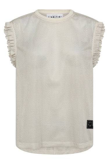 OBS! Fjernlager. Levering kan blive forlænget med 2-3 dage, hvis varen ikke findes i vores butik lige nu.Cool top fra Haute L'Amitié med rund hals, smalle flæsekanter i ærmerne og et smart hullet mønster.