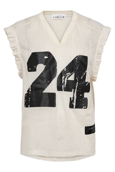 OBS! Fjernlager. Levering kan blive forlænget med 2-3 dage, hvis varen ikke findes i vores butik lige nu.Cool, sporty og feminin tee fra Haute L'Amitié med v-udskæring i halsen, smalle flæsedetaljer og et smart tryk på fronten.