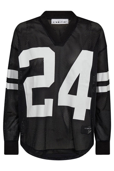 OBS! Fjernlager. Levering kan blive forlænget med 2-3 dage, hvis varen ikke findes i vores butik lige nu.Cool sporty bluse fra Haute L'Amitié med lange ærmer, v-udskæring i halsen og et stort print på fronten.