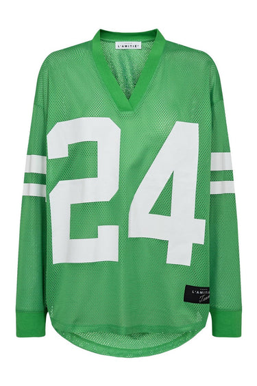 OBS! Fjernlager. Levering kan blive forlænget med 2-3 dage, hvis varen ikke findes i vores butik lige nu.Cool og sporty bluse fra Haute L'Amitie med lange ærmer, v-udskæring i halsen og stor skrift på fronten.