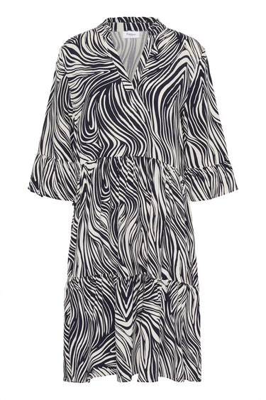 OBS! Fjernlager. Levering kan blive forlænget med 2-3 dage, hvis varen ikke findes i vores butik lige nu.Flot kjole fra Saint Tropez med ¾ lange ærmer, rund hals med v-udskæring og en behagelig afslappet pasform.Kjolen har også fine flæseeffekter i skørtet og et smart print.
