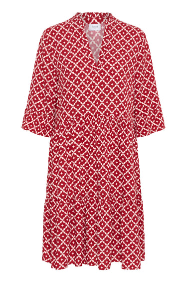 OBS! Fjernlager. Levering kan blive forlænget med 2-3 dage, hvis varen ikke findes i vores butik lige nu.Flot kjole fra Saint Tropez med ¾ lange ærmer, rund hals med v-udskæring og en behagelig afslappet pasform.Kjolen har også fine flæseeffekter i skørtet og et smart print.