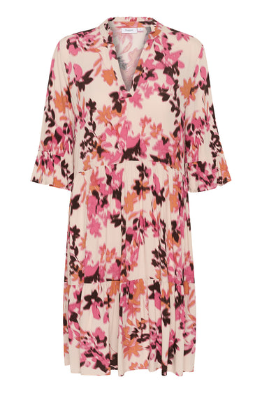 OBS! Fjernlager. Levering kan blive forlænget med 2-3 dage, hvis varen ikke findes i vores butik lige nu.Flot kjole fra Saint Tropez med ¾ lange ærmer, rund hals med v-udskæring og en behagelig afslappet pasform.Kjolen har også fine flæseeffekter i skørtet og et smart print.