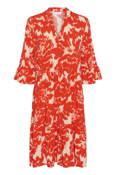 OBS! Fjernlager. Levering kan blive forlænget med 2-3 dage, hvis varen ikke findes i vores butik lige nu.Flot kjole fra Saint Tropez med ¾ lange ærmer, rund hals med v-udskæring og en behagelig afslappet pasform.Kjolen har også fine flæseeffekter i skørtet og et smart print.