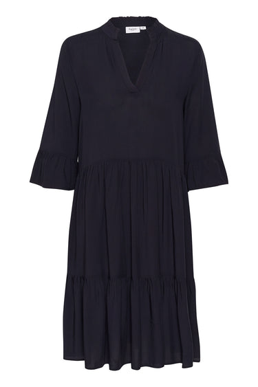 - OBS! Fjernlager. Levering kan blive forlænget med 2-3 dage, hvis varen ikke findes i vores butik lige nu.Flot kjole fra Saint Tropez med ¾ lange ærmer, v-udskæring i halsen og skønne flæseeffekter i skørtet.