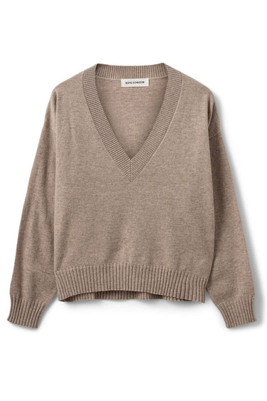 - OBS! Fjernlager. Levering kan blive forlænget med 2-3 dage, hvis varen ikke findes i vores butik lige nu.Blød og lækker strik fra Sofie Schnoor med lange ærmer, dyb v-udskæring i halsen og en afslappet silhuet.