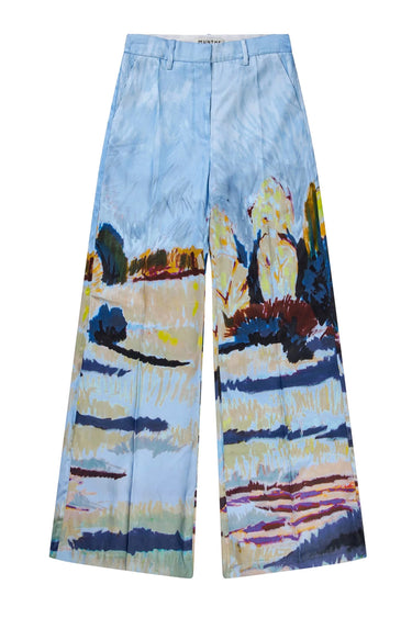 OBS! Fjernlager. Levering kan blive forlænget med 2-3 dage, hvis varen ikke findes i vores butik lige nu.Klassiske bukser fra Munthe designet med et smukt all-over landskabsprint. Bukserne er designet til en normal pasform, med brede ben og lommer i siden.