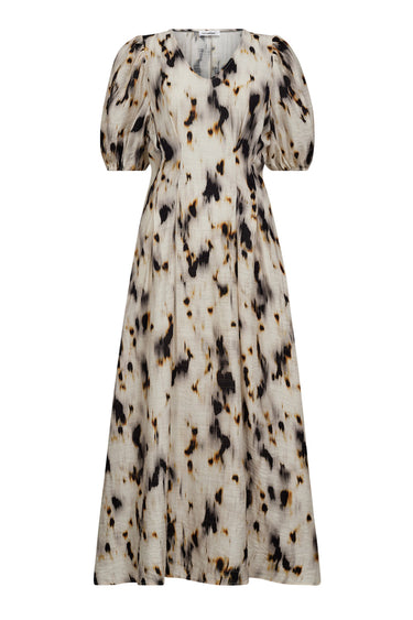 OBS! Fjernlager. Levering kan blive forlænget med 2-3 dage, hvis varen ikke findes i vores butik lige nu.Smuk og feminin kjole fra Co'couture med korte pufærmer, v-udskæring i halsen og et super flot abstrakt print.