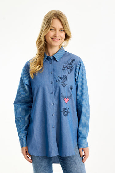 OBS! Fjernlager. Levering kan blive forlænget med 2-3 dage, hvis varen ikke findes i vores butik lige nu.Super flot skjorte fra In Front med lange ærmer, krave i halsen og knaplukning langs fronten. Skjorten har også det skønneste detaljer og en lækker kvalitet.