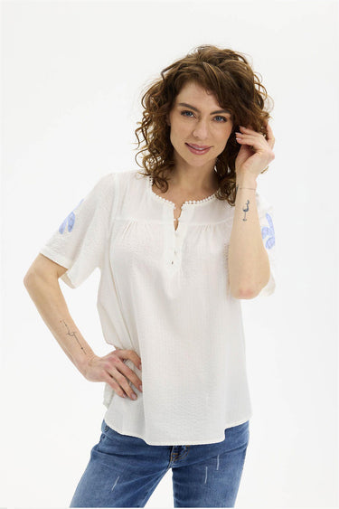 - OBS! Fjernlager. Levering kan blive forlænget med 2-3 dage, hvis varen ikke findes i vores butik lige nu.Feminin bluse fra In Front med korte ærmer, rund hals med små broderet detaljer og skønne blomster på ærmerne og ryggen.