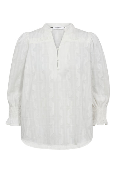 OBS! Fjernlager. Levering kan blive forlænget med 2-3 dage, hvis varen ikke findes i vores butik lige nu.Sød bluse fra Co'couture med ¾ lange ærmer med smock manchetter, kinakrave med v-udskæring i halsen og et super fint tone-i-tone mønster.