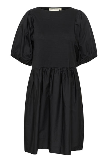 OBS! Fjernlager. Levering kan blive forlænget med 2-3 dage, hvis varen ikke findes i vores butik lige nu.Flot enkel kjole fra InWear med ½ lange pufærmer, en lige halsudskæring og fine flæseeffekter i skørtet.