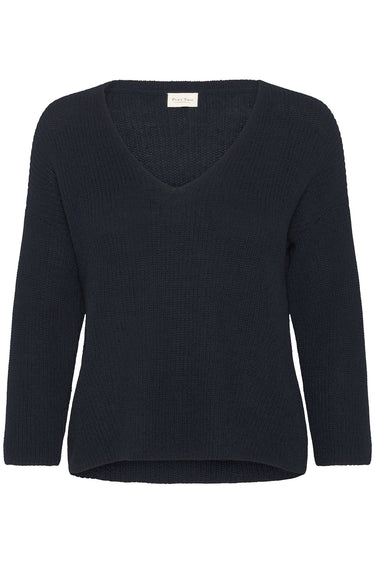 OBS! Fjernlager. Levering kan blive forlænget med 2-3 dage, hvis varen ikke findes i vores butik lige nu.Smart strik fra Part Two med ¾ lange ærmer, v-udskæring i halsen og en afslappet silhuet.
