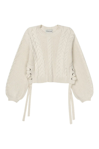 OBS! Fjernlager. Levering kan blive forlænget med 2-3 dage, hvis varen ikke findes i vores butik lige nu.Blød kabelstrik fra Munthe med elegante strikkede bånd i siderne. Denne strik har lange ballonærmer, en rund hals og en rib langs kanterne.