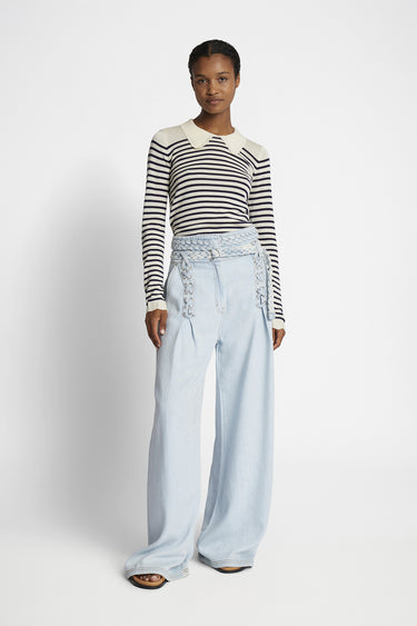 OBS! Fjernlager. Levering kan blive forlænget med 2-3 dage, hvis varen ikke findes i vores butik lige nu.Jeans fra Munthe med en smuk flettet detalje omkring taljen, og en bindebånds detalje ned langs hofterne. Disse jeans er designet med høj talje, brede ben og side lommer.