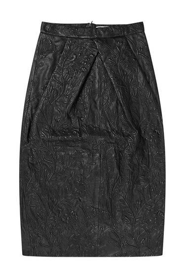 OBS! Fjernlager. Levering kan blive forlænget med 2-3 dage, hvis varen ikke findes i vores butik lige nu.Læder nederdel fra Munthe med et smukt præget blomster mønster, samt brede skulpturelle læg foran. Nederdelen har lommer og en lyslås lukning bagpå, og er designet til en normal pasform.