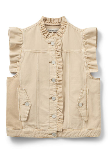 - OBS! Fjernlager. Levering kan blive forlænget med 2-3 dage, hvis varen ikke findes i vores butik lige nu.Super fin vest fra Sofie Schnoor med rund hals, knaplukning langs fronten og smarte lommer foran. Vesten har også en afslappet silhuet og skønne flæsedetaljer.
