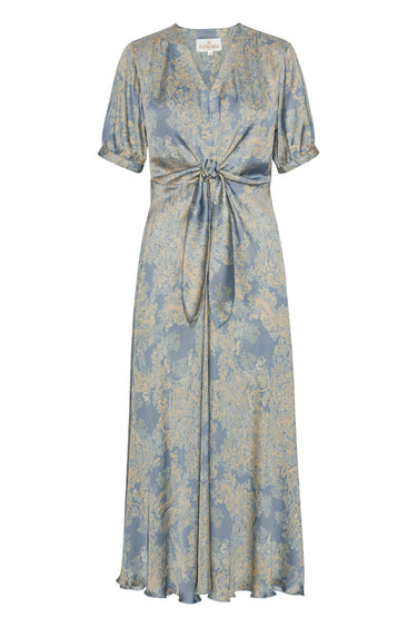 OBS! Fjernlager. Levering kan blive forlænget med 2-3 dage, hvis varen ikke findes i vores butik lige nu.Smuk maxi kjole fra Karmamia med korte ærmer, v-udskæring i halsen og en flot knude detalje foran.