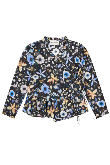 OBS! Fjernlager. Levering kan blive forlænget med 2-3 dage, hvis varen ikke findes i vores butik lige nu.En smuk slå om bluse fra Munthe, med et elegant print lavet af kronblade fra blomster Naja Munthe har plantet i sin egen have. Blusen har en smuk peplum bund, detaljerede kanter, samt en elegant snorelukning. Blusen er designet i en blød silkeblanding.