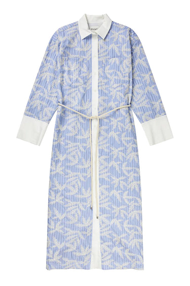 OBS! Fjernlager. Levering kan blive forlænget med 2-3 dage, hvis varen ikke findes i vores butik lige nu.En stribet skjortekjole fra Munthe, designet med et elegant all-over broderi med fine blade. Denne skjortekjole har en smuk let oversize lomme på brystet, en hvid krave, manchetter og en knaplukning. Skjorten er designet med lange ærmer og en elegant binde-detalje i taljen.