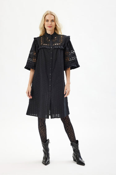 OBS! Fjernlager. Levering kan blive forlænget med 2-3 dage, hvis varen ikke findes i vores butik lige nu.Feminin kjole fra In Front med ½ lange brede ærmer, høj hals og de smukkeste broderet paneler og flæsekanter over brystet og skulderne.Kjolen lukkes også med knaplukning langs fronten.