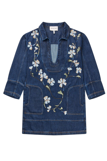 OBS! Fjernlager. Levering kan blive forlænget med 2-3 dage, hvis varen ikke findes i vores butik lige nu.En elegant denim kjole fra Munthe med et smukt blomster mønster. Denne kjole har en dyb v-udskæring, og er designet med store sidelommer og små slidser på hver side af kjolen.