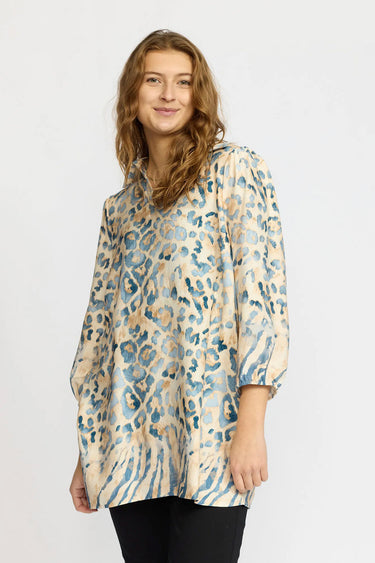 OBS! Fjernlager. Levering kan blive forlænget med 2-3 dage, hvis varen ikke findes i vores butik lige nu.Skøn tunika fra 2-Biz med ¾ lange ærmer, v-udskæring i halsen med en lille krave og et super flot print.