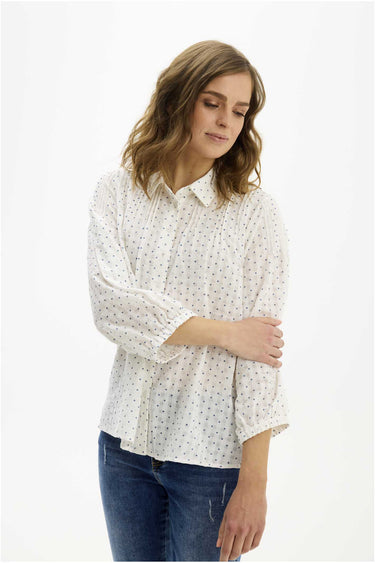 OBS! Fjernlager. Levering kan blive forlænget med 2-3 dage, hvis varen ikke findes i vores butik lige nu.Fin skjortebluse fra In Front med ¾ lange ærmer, en lille krave i halsen og knaplukning langs fronten.