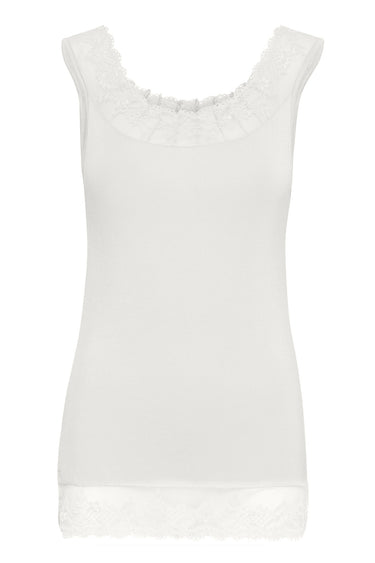 OBS! Fjernlager. Levering kan blive forlænget med 2-3 dage, hvis varen ikke findes i vores butik lige nu.Feminin basis top fra Cream med smukke blondedetaljer.