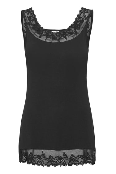 OBS! Fjernlager. Levering kan blive forlænget med 2-3 dage, hvis varen ikke findes i vores butik lige nu.Feminin basis top fra Cream med smukke blondedetaljer.