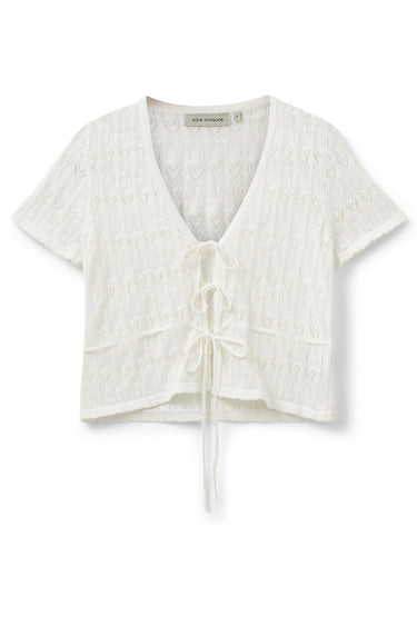 - OBS! Fjernlager. Levering kan blive forlænget med 2-3 dage, hvis varen ikke findes i vores butik lige nu.Elegant bluse fra Sofie Schnoor med korte ærmer, v-udskæring i halsen og små bindebånd langs fronten.
