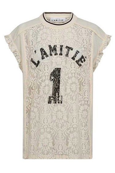 OBS! Fjernlager. Levering kan blive forlænget med 2-3 dage, hvis varen ikke findes i vores butik lige nu.Sporty og feminin top fra Haute L'Amitié med rund hals, korte flæseærmer og et cool print på fronten.