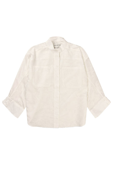 OBS! Fjernlager. Levering kan blive forlænget med 2-3 dage, hvis varen ikke findes i vores butik lige nu.Skjorte fra Munthe designet med et elegant print med elementer af nostalgisk charme. Denne skjorte er designet til at være semi-transparent, og har to let oversize brystlommer, smukke brede manchetter og en elegant krave. Skjorten har en knaplukning og er designet til at være oversize.