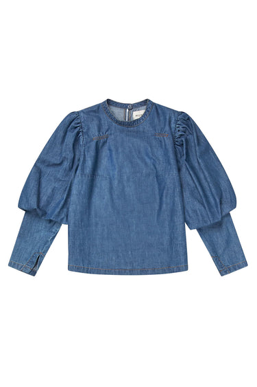 OBS! Fjernlager. Levering kan blive forlænget med 2-3 dage, hvis varen ikke findes i vores butik lige nu.En smuk denim bluse fra Munthe med en elegant puf effekt fra skulder til albue. Denne bluse har en knaplukning på ryggen.
