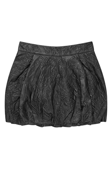 OBS! Fjernlager. Levering kan blive forlænget med 2-3 dage, hvis varen ikke findes i vores butik lige nu.En kort ballon nederdel fra Munthe i læder, designet med et smukt præget blomster mønster. Nederdelen har lynlås og en normal pasform.