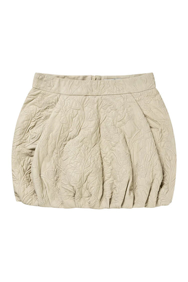 OBS! Fjernlager. Levering kan blive forlænget med 2-3 dage, hvis varen ikke findes i vores butik lige nu.En kort ballon nederdel fra Munthe i læder, designet med et smukt præget blomster mønster. Nederdelen har lynlås og en normal pasform.