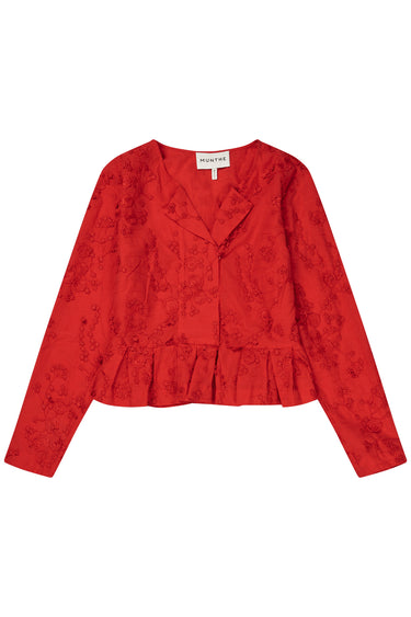 OBS! Fjernlager. Levering kan blive forlænget med 2-3 dage, hvis varen ikke findes i vores butik lige nu.Bluse fra Munthe med smukke all-over blomster applikationer og en elegant peplum bund. Blusen kan åbnes halvvejs ned, og er designet med en skjulte knapper.