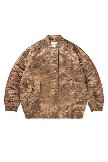 OBS! Fjernlager. Levering kan blive forlænget med 2-3 dage, hvis varen ikke findes i vores butik lige nu.En bomber jakke fra Munthe designet med et smukt nostalgisk print. Jakken har lommer, en skjult lynlås lukning, bred rib ved ærmer og bund, og er designet til en løs pasform.