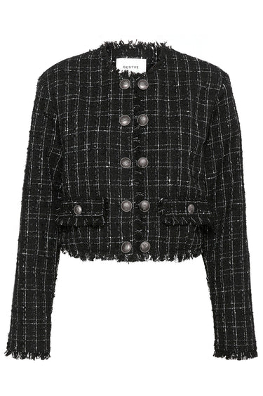 Flot jakke fra Gestuz med lange ærmer, rund hals og flotte knapper langs fronten.Jakken har også et smart ternet print, lommer i siderne og en cropped længde med rå kanter.