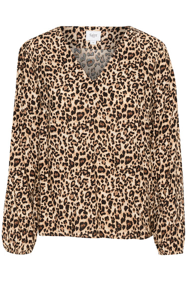 OBS! Fjernlager. Levering kan blive forlænget med 2-3 dage, hvis varen ikke findes i vores butik lige nu.Smart bluse fra Saint Tropez med lange ærmer, v-udskæring i halsen og et cool leopard print i naturlige farver.