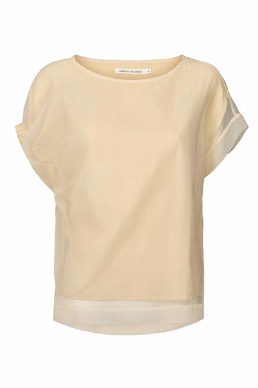 OBS! Fjernlager. Levering kan blive forlænget med 2-3 dage, hvis varen ikke findes i vores butik lige nu.Cool bluse fra Rabens Saloner med et asymmetrisk twist omkring ærmerne der giver den et unikt udtryk.Blusen har også en boxy silhuet, et luftigt mesh yderlag og bådudskæring i halsen.