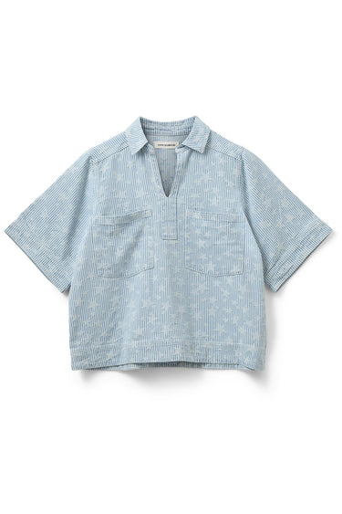 - OBS! Fjernlager. Levering kan blive forlænget med 2-3 dage, hvis varen ikke findes i vores butik lige nu.Smart denim bluse fra Sofie Schnoor med korte ærmer, en lille krave og v-udskæring i halsen samt fine lommer på brystet og et diskret stjernemønster.