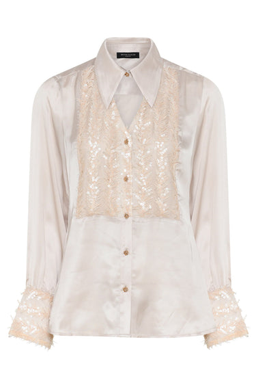 - OBS! Fjernlager. Levering kan blive forlænget med 2-3 dage, hvis varen ikke findes i vores butik lige nu.Feminin skjorte fra Bruuns Bazaar med et elegant udtryk, fine pailletter og et luksuriøst look.Skjorten har også lange ærmer, skønne detaljer og knaplukning langs fronten.
