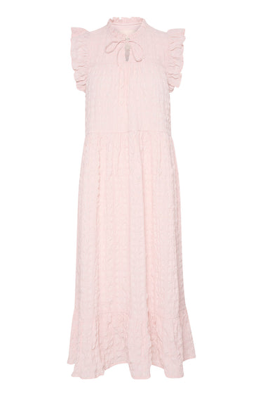 OBS! Fjernlager. Levering kan blive forlænget med 2-3 dage, hvis varen ikke findes i vores butik lige nu.Feminin kjole fra Part Two med fine flæseærmer, rund hals med bindesnor over brystet og de skønneste flæseeffekter.