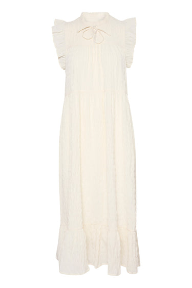 OBS! Fjernlager. Levering kan blive forlænget med 2-3 dage, hvis varen ikke findes i vores butik lige nu.Feminin kjole fra Part Two med fine flæseærmer, rund hals med bindesnor over brystet og de skønneste flæseeffekter.