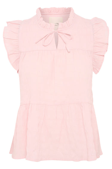 OBS! Fjernlager. Levering kan blive forlænget med 2-3 dage, hvis varen ikke findes i vores butik lige nu.Fin bluse fra Part Two med små flæseærmer, rund hals med en lille v-udskæring og bindesnor samt en let kvalitet og en afslappet silhuet.
